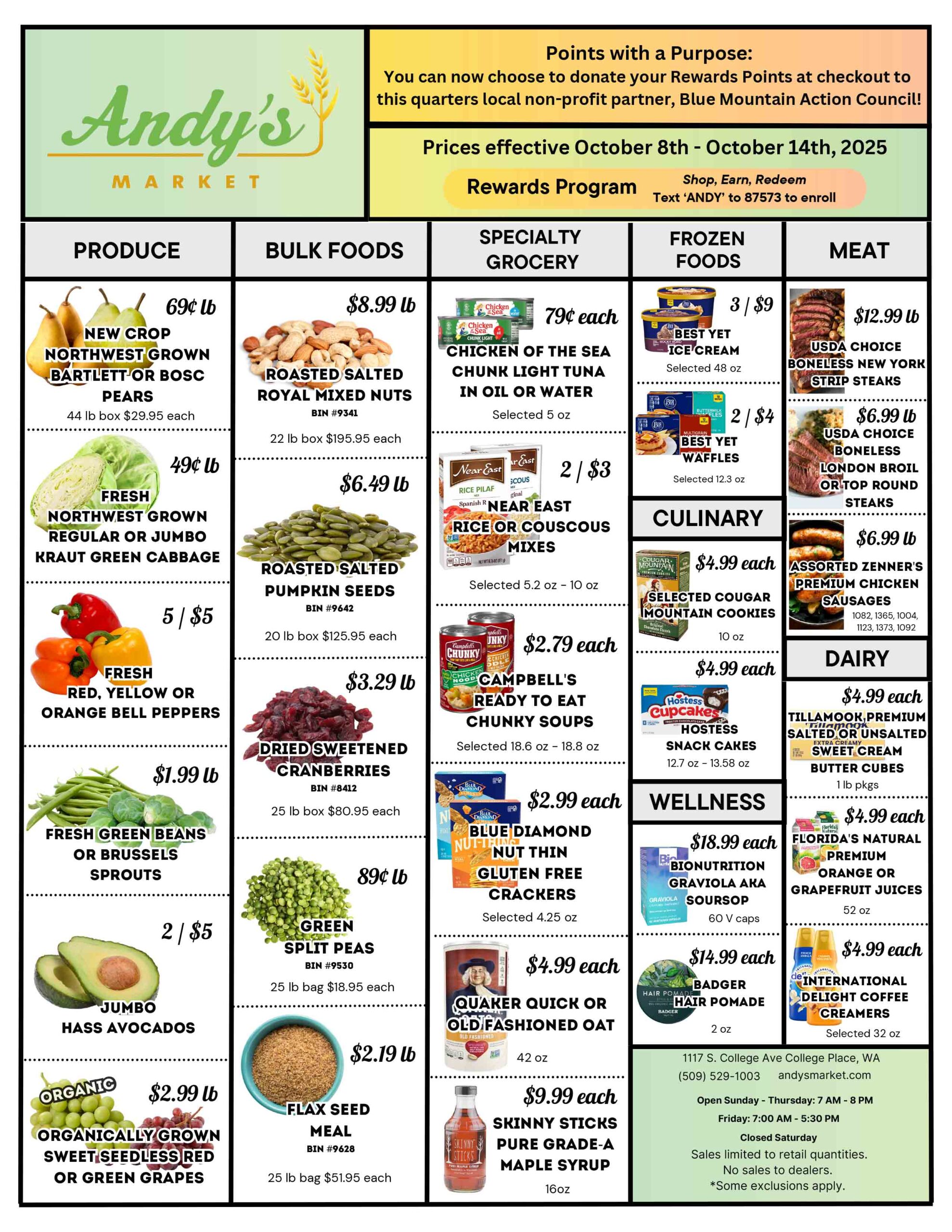 Andy’s Market is a family-owned business that has been serving Walla Walla and the Northwest for over fifty years. We specialize in nutritious and wholesome food products. Our mission is to provide quality and service at a fair competitive price. We appreciate your interest in andysmarket.com and are committed to providing you with the highest level of customer service.